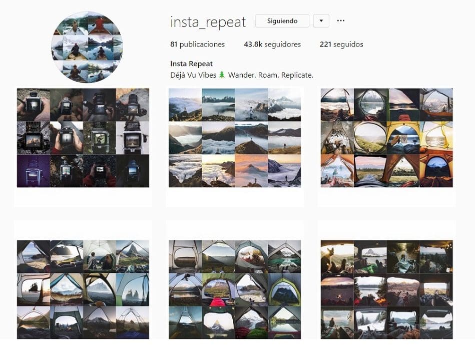 La persona detrás de @insta_repeat es una mujer de 27 años, cineasta y artista que vive en Anchorage, Alaska. Sin embargo, ella no ha revelado por completo su identidad. Con más de 18 mil seguidores, el lema de su cuenta es “Pasear, vagar, replicar”, en donde podrás encontrar collages de imágenes cliché de viajes que puedes encontrar en toda la plataforma de Instagram.